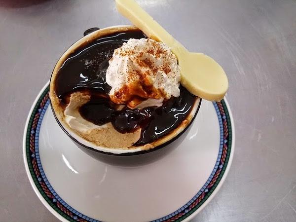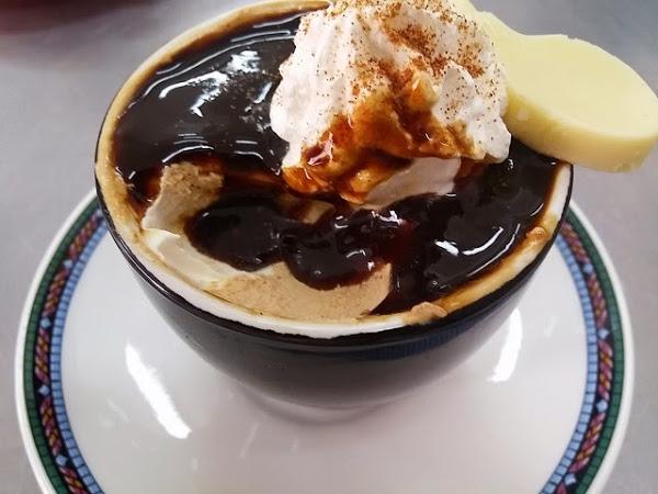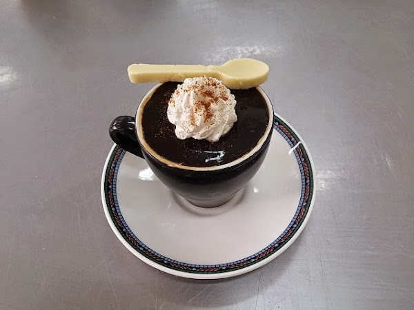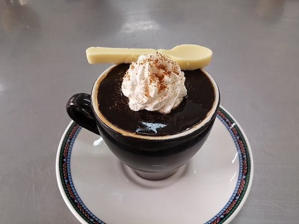 Preparación Calentar un dl. del café y diluir en él las dos hojas de gelatina previamente hidratadas y escurridas. Mezclar con otro dl. del café, añadir la leche condensada y por último la nata (crema de leche) semimontada bien fría. Poner la preparación resultante en tazas y dejar en la nevera. Mientras tanto reducir el café restante con el azúcar hasta que quede espesito. Dejar enfriar. En el momento de servir poner una cucharada de la reducción del café en cima de la mousse, luego una roseta de nata montada (crema de leche), salpicar con canela molida y colocar una cucharita de chocolate blanco. Listo para servir