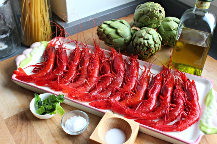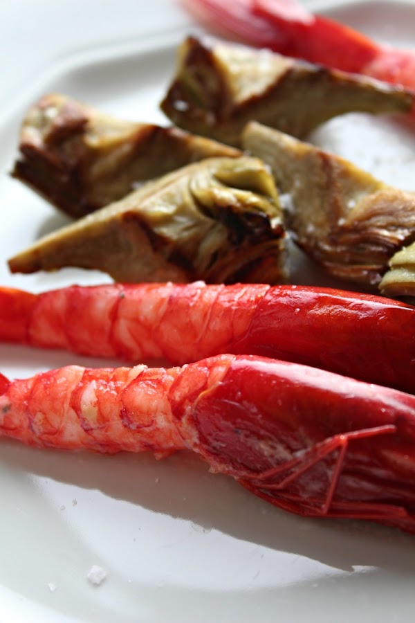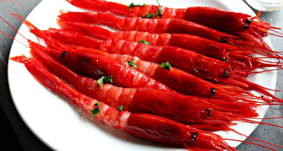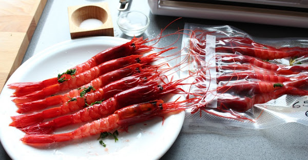 Los carabineros: Limpiamos, dejando cabeza y cola. Pasamos por sal gorda y perejil. Embolsamos con un chorrito de aceite.