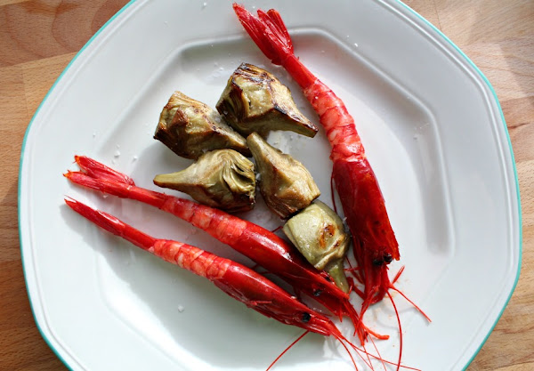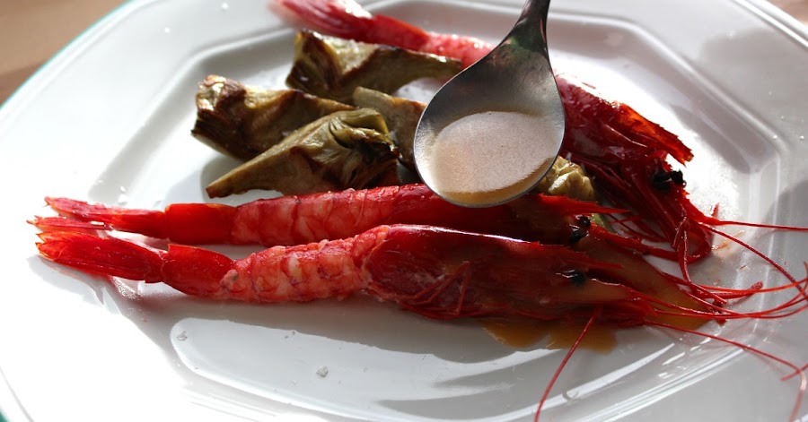 Al jugo de la bolsa de los carabineros, le añadimos un poco de aceite y emulsionamos con varillas ... Bañaremos, los ingredientes en el momento de servir.