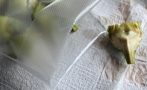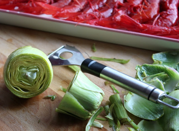 Limpiamos las alcachofas, quitando hojas exteriores y puntas. Sumergimos en agua con perejil, para que no se oxide.