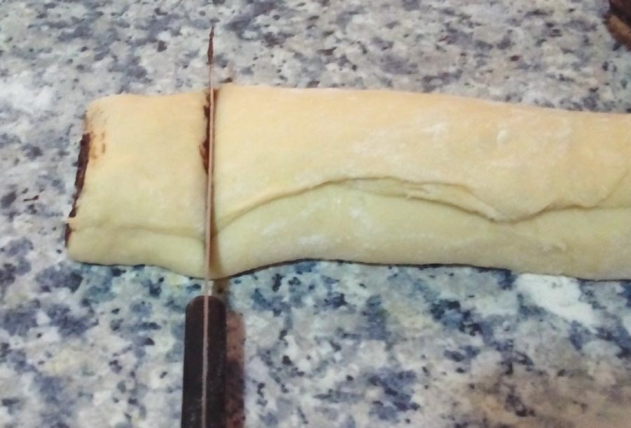 Con un cuchillo bien afilado se va cortando en rodajas la masa de 2 dedos de ancho.