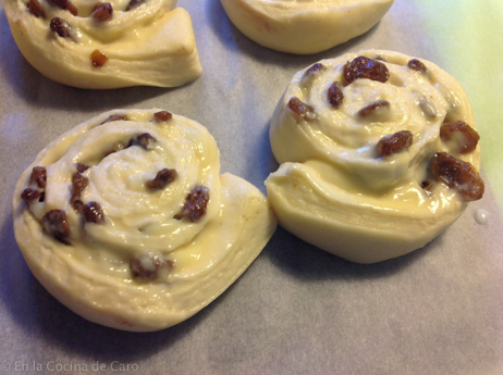 Las vamos colocando sobre un papel de horno y pincelamos con leche y azúcar. Colocamos en el horno con la luz encendida pero sin temperatura por espacio de una hora, tienen que casi duplicar su tamaño.