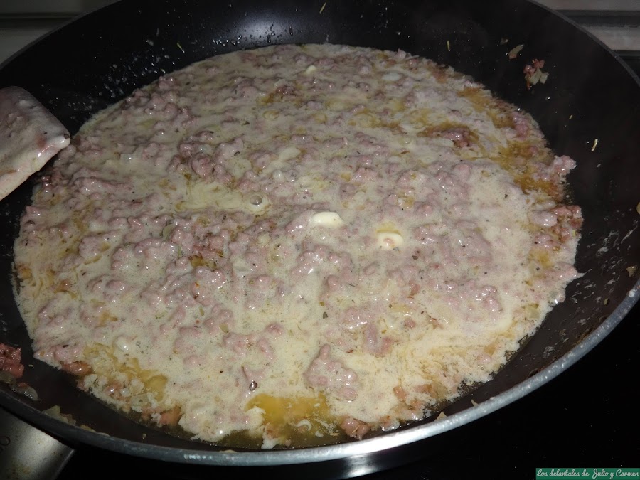 Cuando la carne esté lista, vertemos el mascarpone y el chorrito de nata (crema de leche) y removemos hasta que quede todo perfectamente integrado.