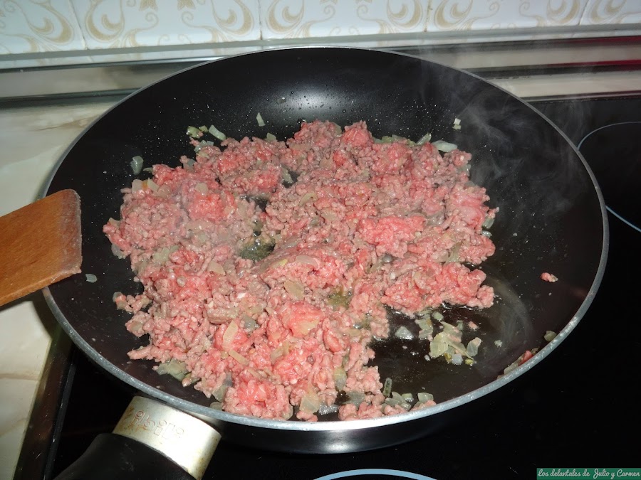 Cuando veamos que la cebolla está dorada, echamos la carne picada y subimos un poco el fuego, removiendo para que se cocine bien. Salamos y echamos las especias al gusto y continuamos removiendo, para que se integren todos los sabores.
