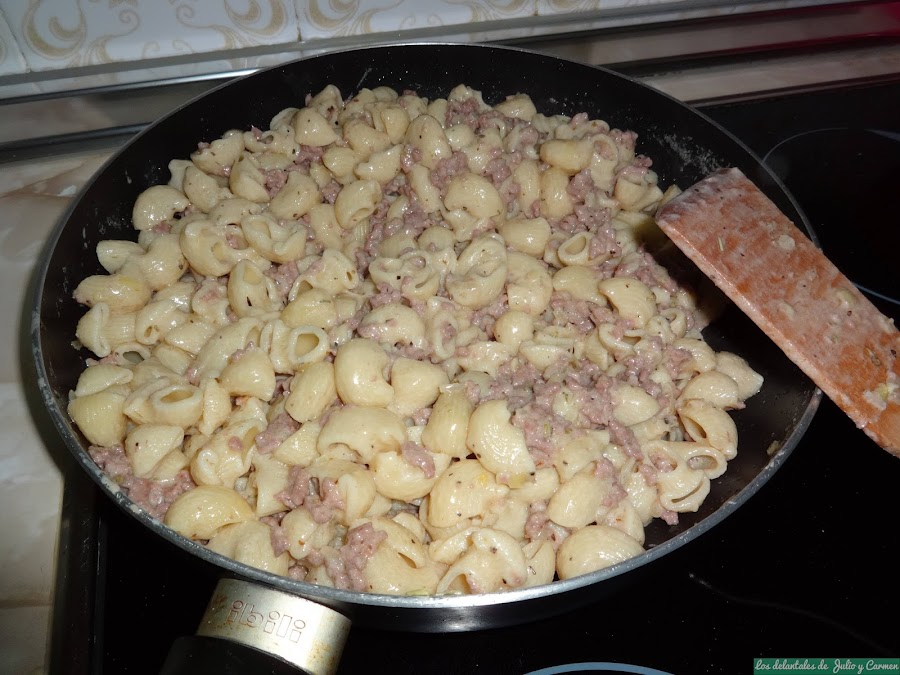 Vertemos la pasta sobre la salsa y removemos, manteniendo un par de minutos para que se cocinen todos los ingredientes juntos.