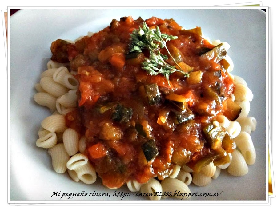 Ahora cortaremos las verduras en trozos pequeños y los ponemos a pochar en otra sartén a fuego lento con un chorrito de aceite de oliva y una pizca de sal, dejaremos pochar hasta que las verduras comiencen a ablandarse, una vez conseguido ese punto le ponemos la salsa de tomate, pero antes le quitaremos a las verduras el exceso de agua que han soltado y lo dejamos a fuego lento cocinar.