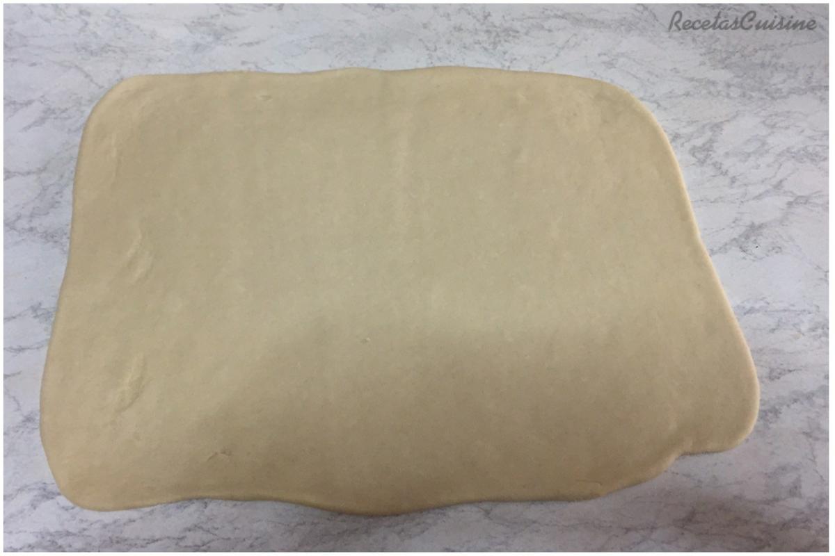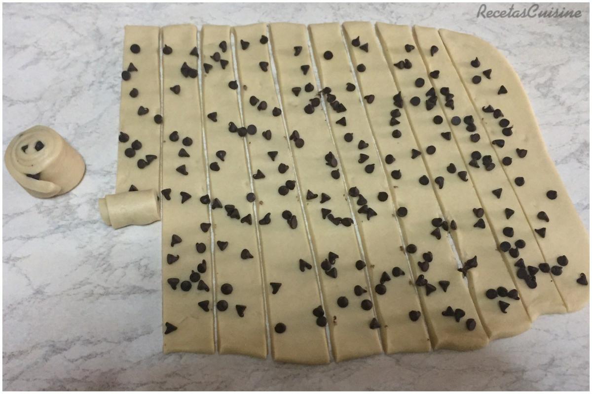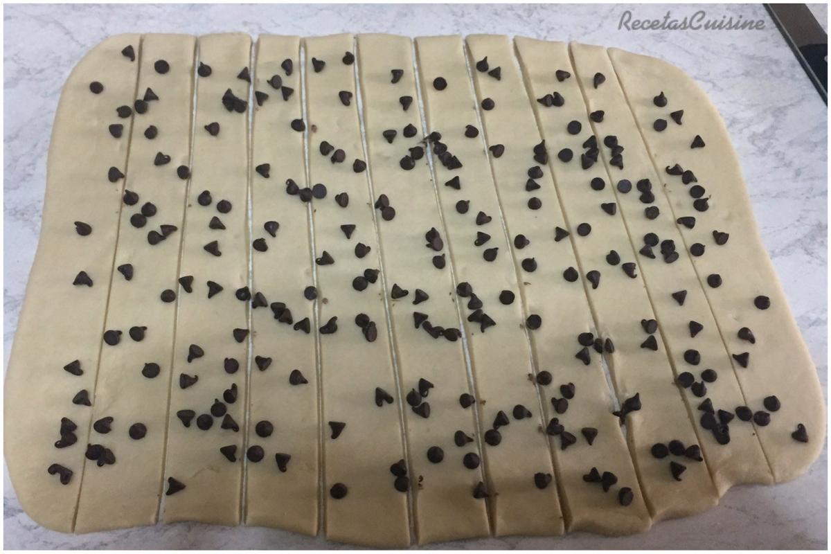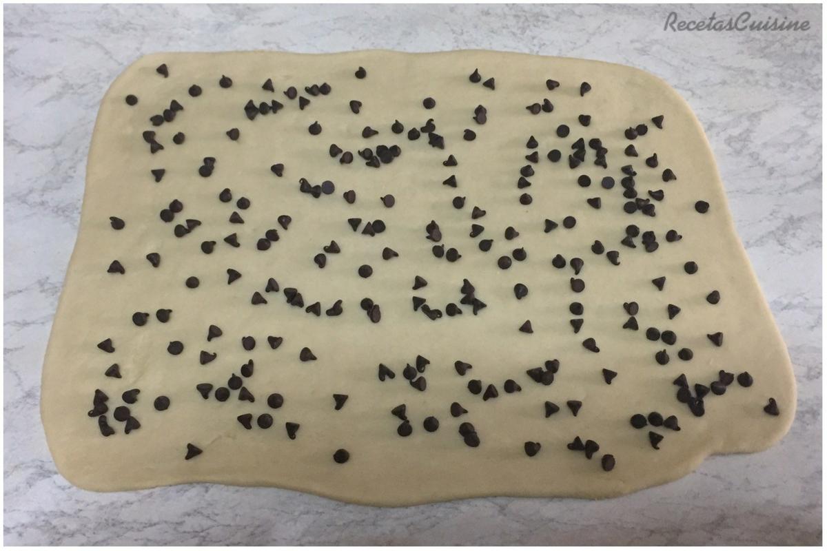 6. Estiramos con el rodillo formando un rectángulo y vamos poniendo las pepitas de chocolate por toda la masa estirada.