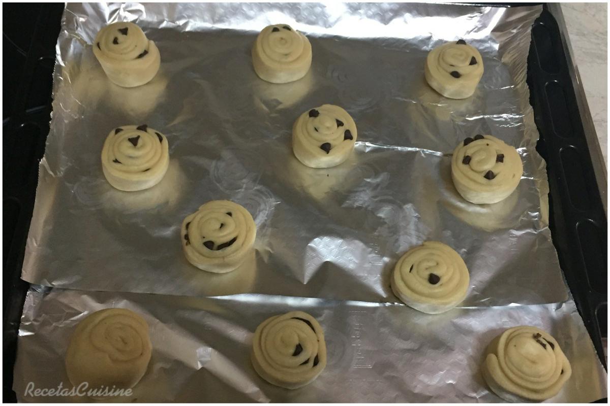 8. Las vamos dejando en la bandeja del horno, sobre papel de hornear (yo puse papel de aluminio porque no tenía de hornear), dejando una separación entre ellas. Metemos la bandeja en el horno apagado y dejamos que fermenten y aumenten de tamaño (durante 90 minutos aprox.)