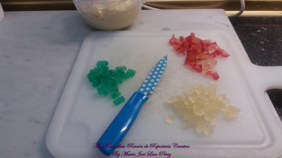Distribuiremos encima de la crema, la macedonia de frutas confitadas, finamente picadas.