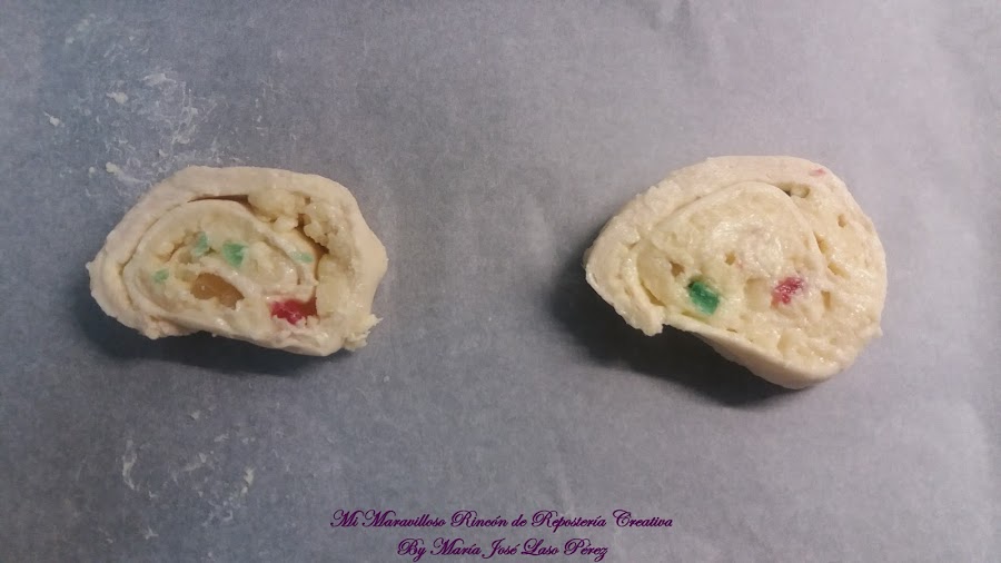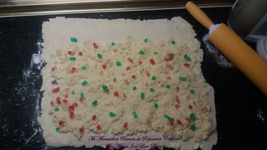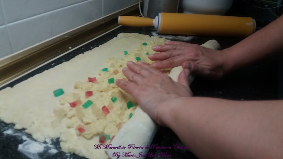 Se enrolla sobre si mima, empezando por el borde inferior o más próximo a nosotros hasta llegar a la parte pintada de huevo que nos servirá para pegar la masa.