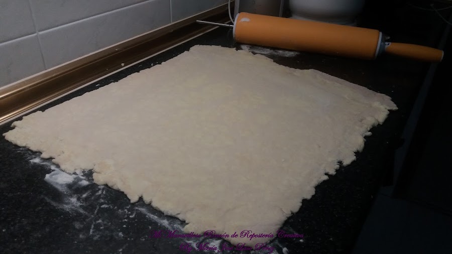 Sacamos el hojaldre del congelador y dejamos que se descongele. Cuando lo tengamos a temperatura ambiente, ya podemos extenderlo con un rodillo. Espolvoreamos con harina la mesa de trabajo y lo extendemos a lo largo y a lo ancho. Procurando un grosor de 2,5 mm aproximadamente.