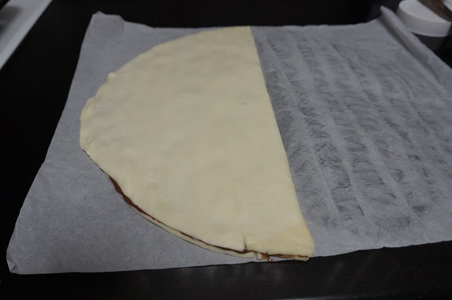 Marcamos la masa por la mitad y untamos de chocolate una de las partes del hojaldre.