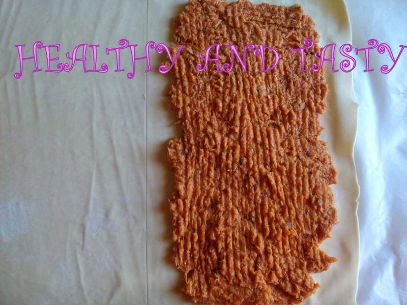 Rellenamos cada mitad de la masa con la mezcla de atún, dejando los bordes sin relleno.