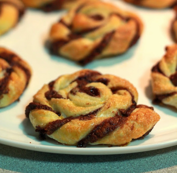 Corta el hojaldre a lo largo en tiras de dos dedos de ancho y úntalas de Nutella. Sé que adoras el chocolate. Sé que adoras la Nutella. Pero no me seas burro y le pongas un kilo por cada tira de hojaldre. Hay que untarlas un poco, pero no demasiado o luego se desparramará todo por el horno.