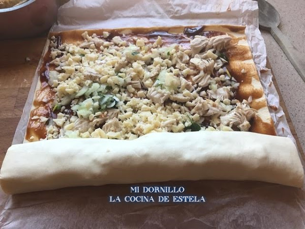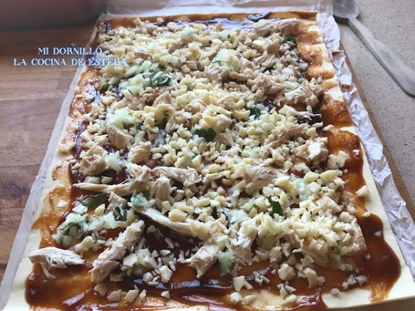 Pintamos con la salsa barbacoa,cubriendo bien por todo el cuadrado, repartimos el pollo en tiras por todo el cuadrado