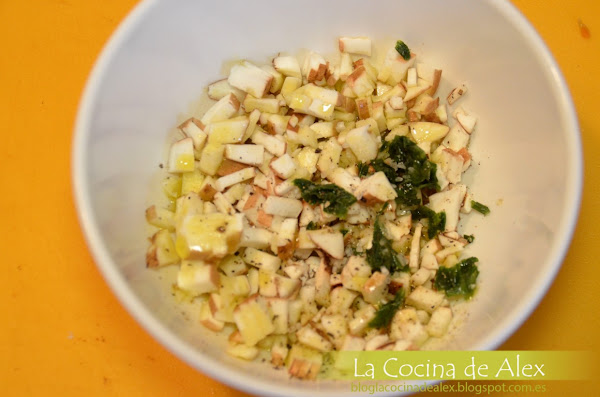 Opcionalmente vamos a preparar una "vinagreta", cortamos muy fino la parte de arriba de los portobello que habíamos reservado, le añadimos el cebollino picado, sal, pimienta y un poco de aceite de oliva.