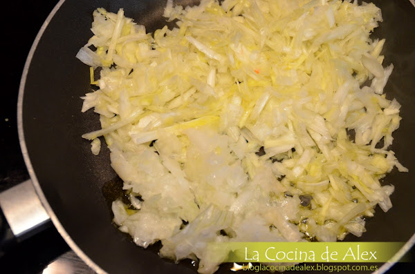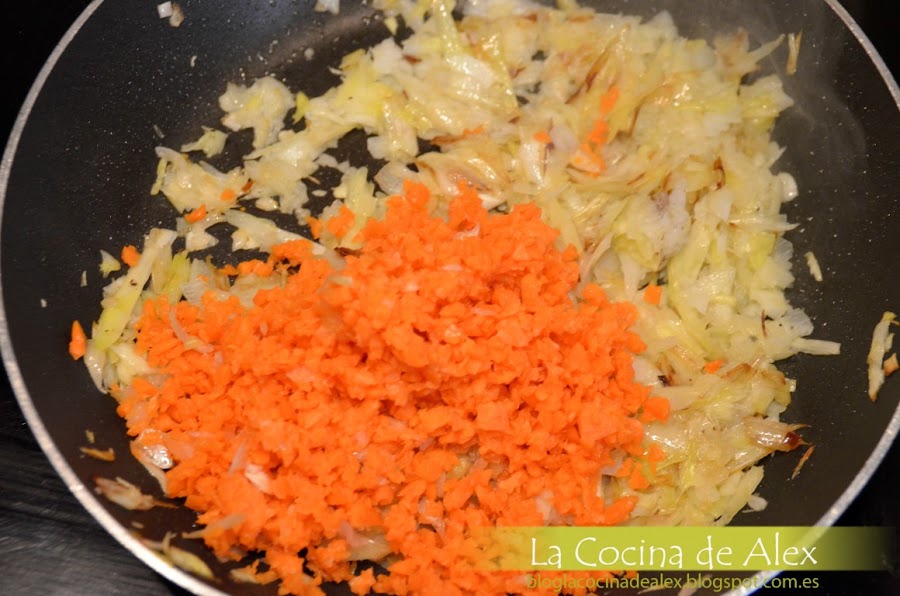 Preparamos dos sartenes con un poco de aceite, en la primera vamos a prepara el relleno de la pasta, cuando el aceite este caliente ponemos a sofreír el puerro junto con la mitad de la cebolleta. Cuando este bien dorado añadimos la zanahoria y seguiremos cocinando a fuego medio para que no se dore en exceso.