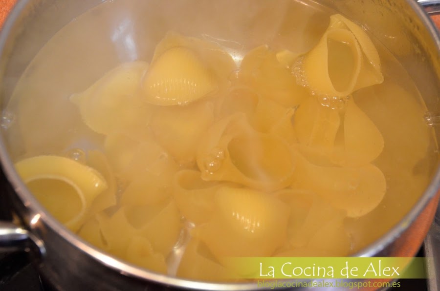 Mientras hacemos tanto el relleno como el tomate frito también vamos a cocer la pasta durante unos 15 minutos o lo que nos indique el paquete y luego la escurrimos con la ayuda de un colador. El hacer todo a la vez es para conseguir que este todo caliente y terminado a la misma vez.