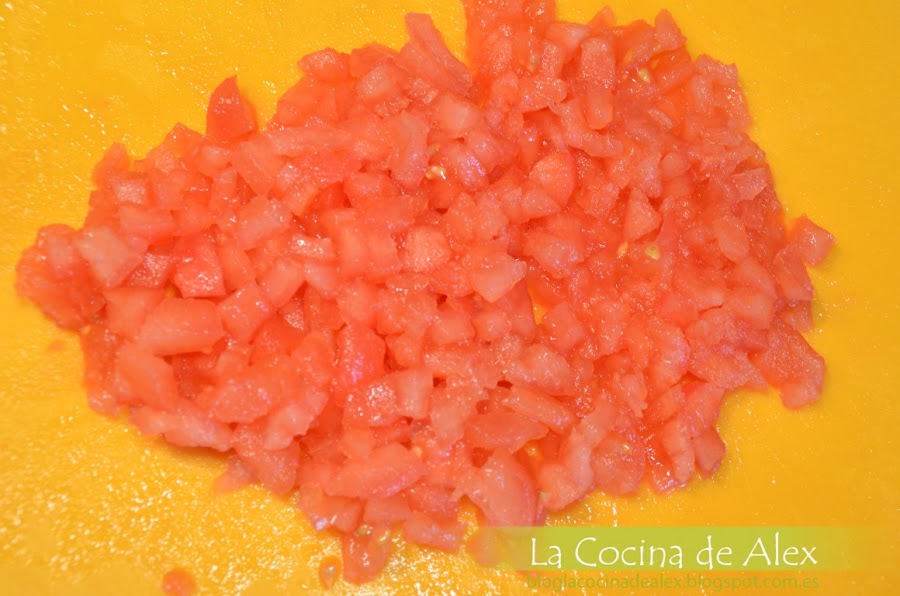 El tomate lo picaremos "concassé", es decir, lo pelaremos con la ayuda de un pelador, retiramos las semillas interiores (reservándolas) y picaremos la carne en pequeños cubos.