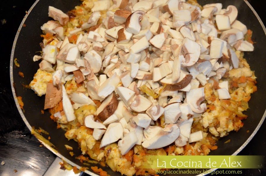 Una vez esta la verdura blanda, añadimos la carne picada, previamente salpimentada, cocinamos y en ultimo lugar cuando este la carne cocinada añadimos los portobello picados. Cocinamos a fuego bajo.