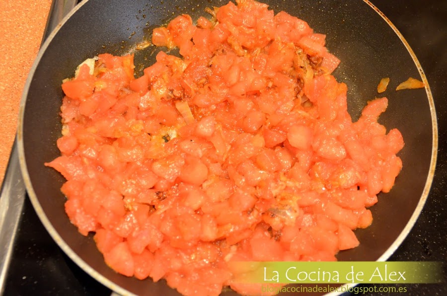 En la segunda sarten, preparamos el tomate frito con el que vamos a acompañar la pasta, ponemos a sofreír la otra mitad de la cebolleta que no habíamos usado y cuando este pochada añadimos el tomate, salpimentamos y cocinamos a fuego medio bajo durante 10-15 minutos hasta que el tomate este hecho.