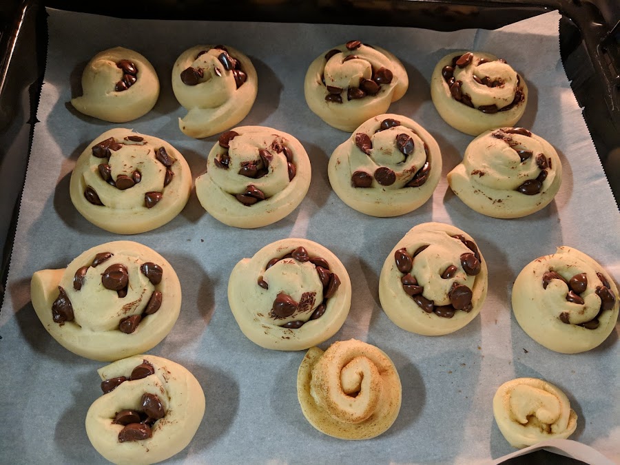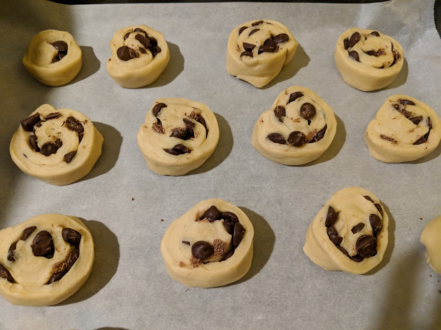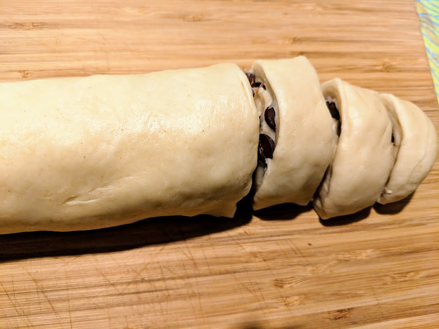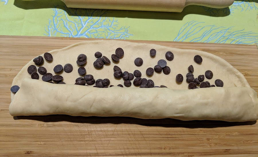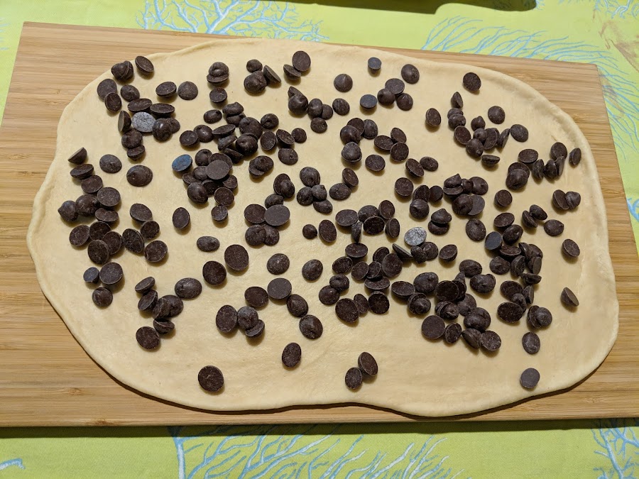 Dividimos y estiramos una de las partes formando un rectángulo. Echamos perlas de chocolate y formamos un rollo