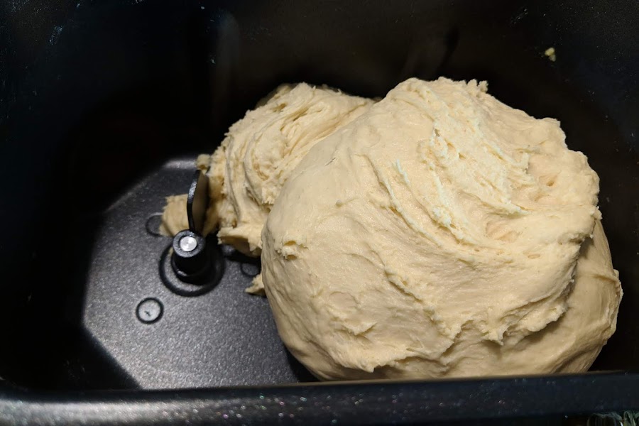 600 g de harina HTZPonemos en la cubeta de la panificadora salvo la mantequilla y seleccionamos menú dulce (4 en la panificadora de 16 programas) A la media hora o cuando estén lo ingredientes bien integrados, añadimos la mantequilla