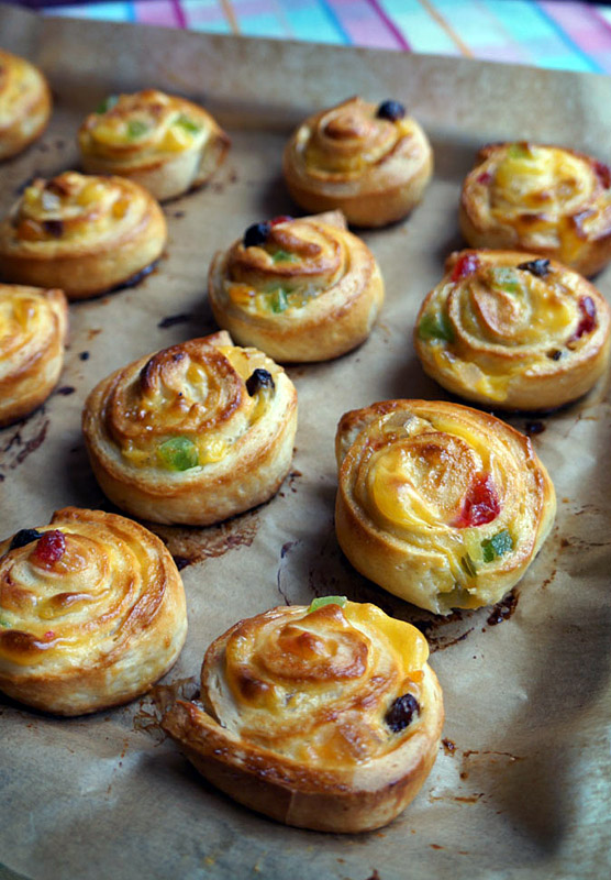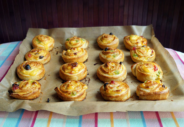 Hoy os presento uno de los dulces favoritos en casa, las caracolas rellenas de crema pastelera, fruta escarchada y pasas. Toda una delicia, las hice pequeñitas y es imposible comerse una sola.