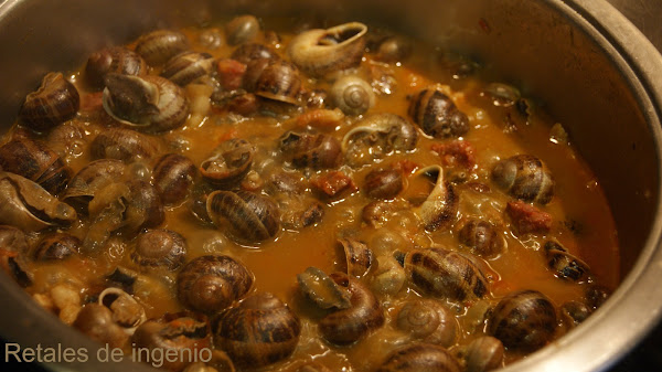 Se cocina todo unos minutos, se sazona con un poco de sal y pimienta y se les añade los caracoles, se cubren con el caldo de cocerlos y se dejan cocer hasta que estén tiernos y por último se le añade la cucharadita de maicena diluida en un poco de caldo o agua, se deja espesar la salsa y listo.