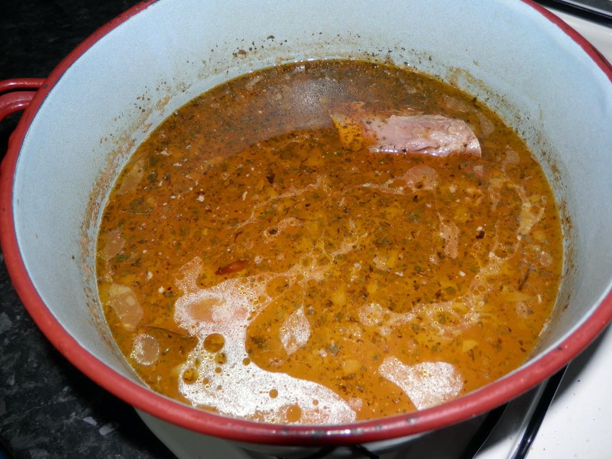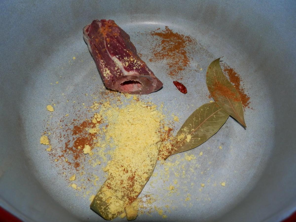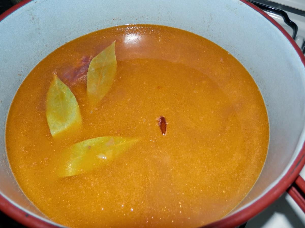 En una olla, que será en la que cocinemos los caracoles, ponemos el laurel, el hueso de jamón, el caldo de pollo (una pastilla), la guindilla y el pimentón.