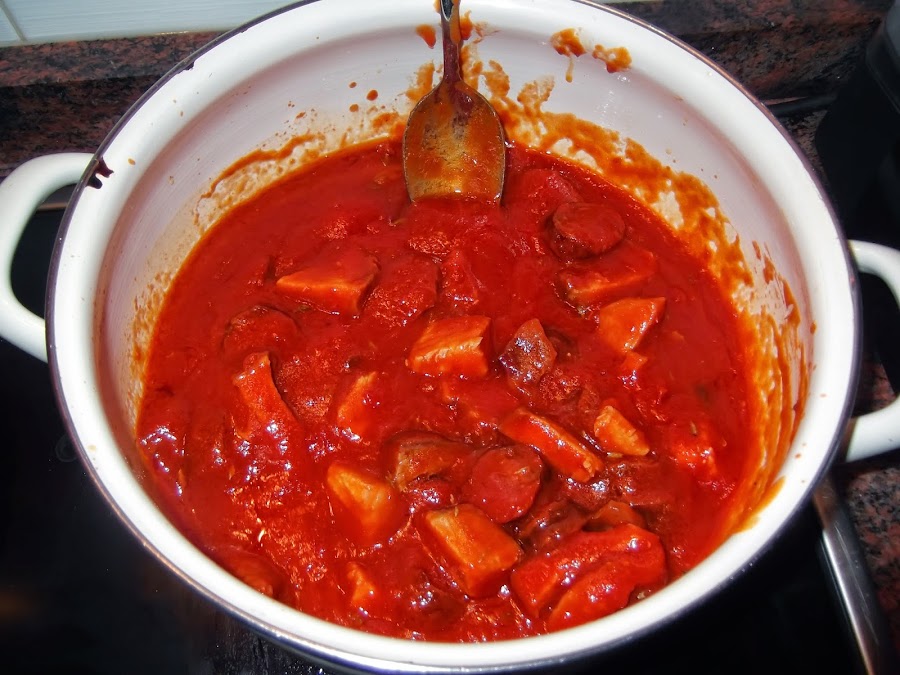 A continuación, añadís el tomate, un poco de orégano y sal. Lo dejáis cociendo 15 minutos para que la salsa se vaya impregnando de todos los sabores. Mientras tanto podéis ir cociendo los huevos, ya sabéis cuando empiece el agua a cocer los echáis y los dejáis durante 10 minutos.