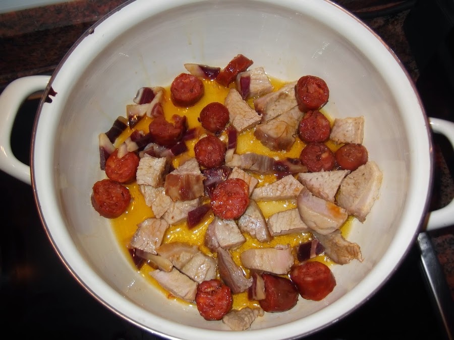 Una vez que tenemos los caracoles listos comenzamos con el sofrito, echamos un poco de aceite en una olla y los dientes de ajo bien cortados. Cuando están casi dorados, se les añade el lomo y el jamón y finalmente el chorizo. Yo utilicé lomo y chorizo de olla y por lo tanto no tuvieron que estar mucho tiempo friéndose, ya que están cocinados, si no añadírselo antes. Como sabéis el chorizo suele soltar bastante grasilla, si queréis reducir el número de calorías del plato se la podéis quitar, pero a mi me gusta dejarla, ya que la salsa es lo mejor de este plato y le da un sabor espectacular.