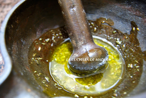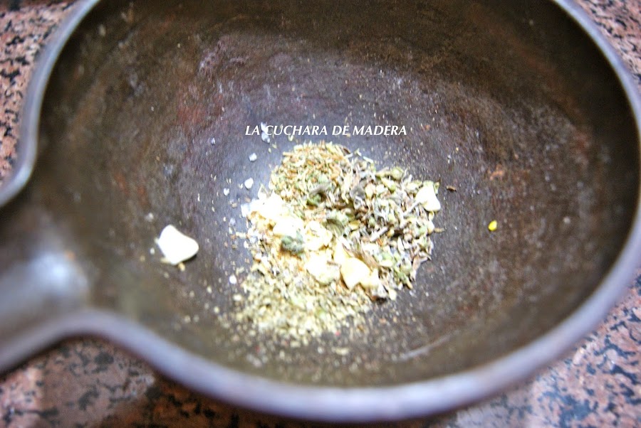 En un mortero ponemos todas las aromáticas y el ajo,majamos bien para mezclar todos los ingredientes; prefiero hacerlo en el mortero que en una batidora ya que el sabor de cada aromática se potencia más