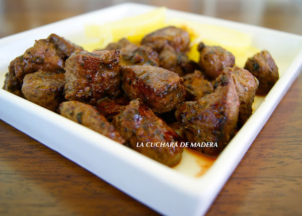 En un plato pequeño o bandeja colocamos en un lado las papas y en otro el hígado con la salsa del majado en la que lo hemos cocinado.