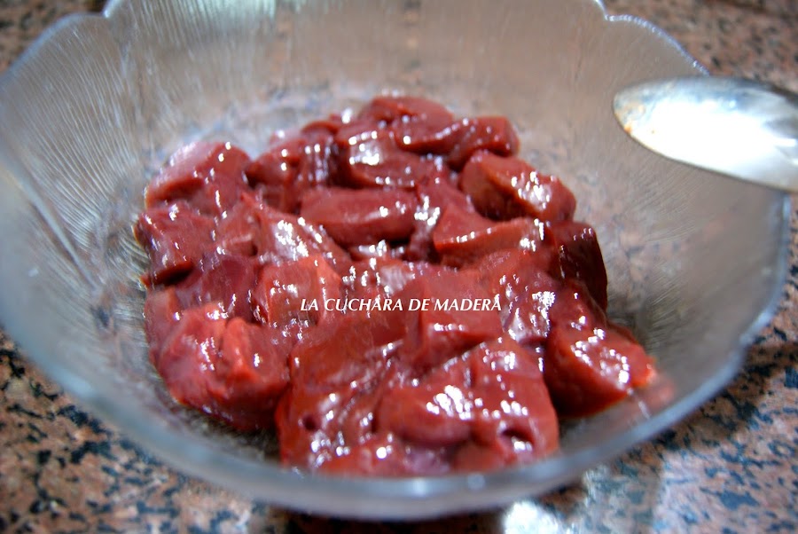 Cortamos el hígado en trozos pequeños, le pedimos al carnicero que no sean muy finos los filetes de hígado y lo colocamos en un bol.