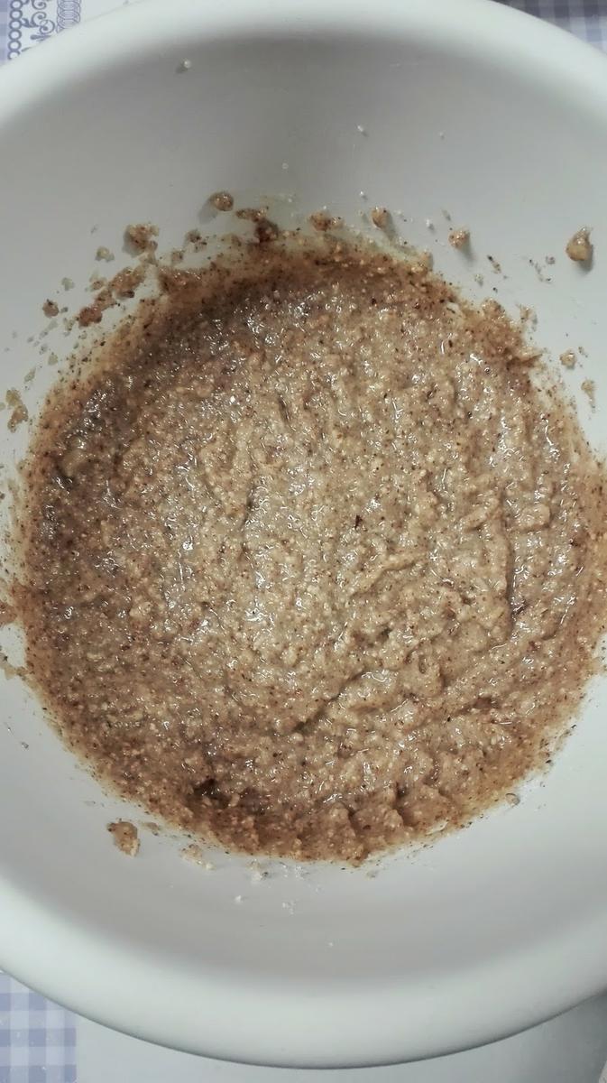En un bol amplio las mezclamos junto con el azúcar y la clara de huevo obteniendo una masa blanda y pegajosa