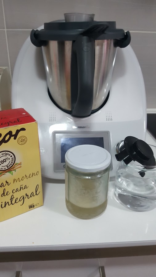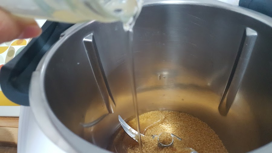 1.- Ponemos en el vaso de la thermomix el azúcar moreno y el azúcar invertido y programamos 5 minutos, 100º, velocidad 1.