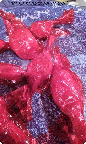 Reboza en azúcar glass para que no se peguen unos a otros y puedes envolverlos. Yo los puse primero en papel de seda y después en celofán de colores.