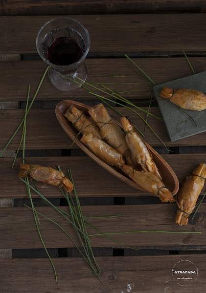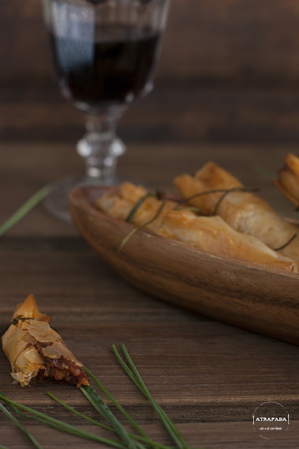 Para terminar la semana os traigo un aperitivo de esos que gustan tanto para una cena o comida de picoteo. La pasta filo da mucho juego en este tipo de elaboraciones pequeñitas, de bocado, tanto dulces como saladas. Se le puede dar forma de saquito o de caramelo y cerrarlo con cebollino. En esta ocasión los he rellenado de sobrasada y miel, un relleno que vi en el blog Como agua para chocolate. Nada dice de la miel que le pone, supongo que será la de flores, aunque yo he puesto miel de caña, que tanto nos gusta en casa, y el resultado ha sido muy bueno. Unos crujientes caramelos por fuera con una explosión de sabores por dentro.