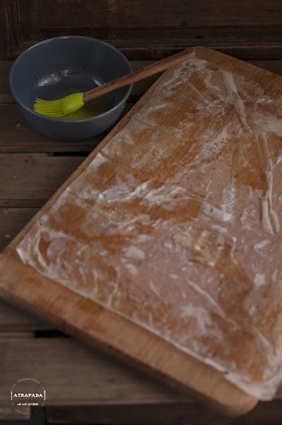 Derretimos la mantequilla en el microondas y con la ayuda de un pincel de cocina pintamos por ambos lados de la hoja, con mucho cuidado de no romperla. Cortamos a lo ancho en tiras de unos cuatro dedos de ancho. Doblamos cada tira sobre si misma, y en el centro ponemos un pegote de sobrasada y por encima un poquito de miel.