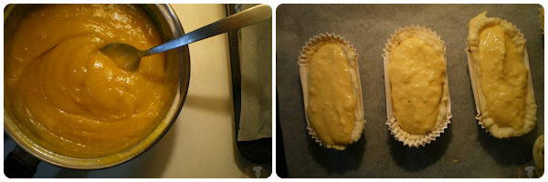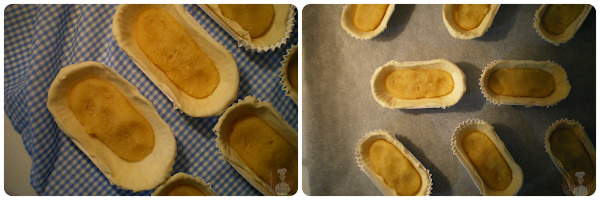 Sacar la masa del frigorífico, dividirla en 8 partes iguales y darles forma de croquetas. Disponer cada porción de masa sobre los moldes hojaldrados.