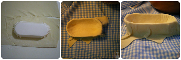 Extender la lámina de hojaldre sobre una superficie limpia y espolvoreada con azúcar glas. Poner encima los moldes y cortar alrededor de los mismos de manera que sobresalga bastante hojaldre para poder forrarlos sin quedarnos cortos al rellenarlos. Forrar los moldes con el hojaldre una vez cortado.