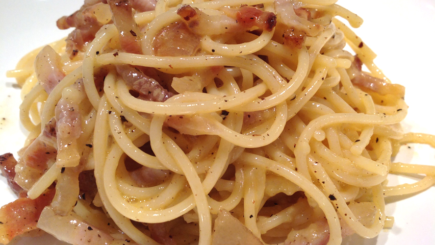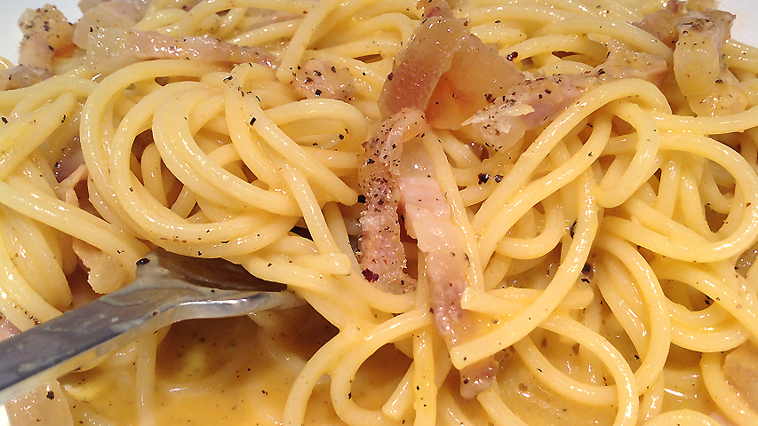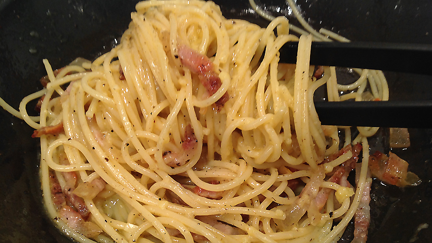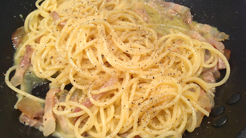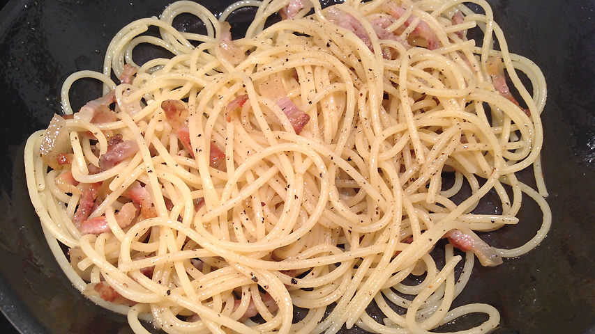 Cuando la pasta esté cocida a tu gusto sácala de la olla e introdúcela en la sartén de la panceta. El fuego debe estar apagado. Mezcla la panceta y la pasta y añade pimienta molida abundante.