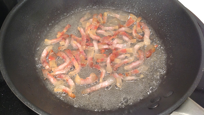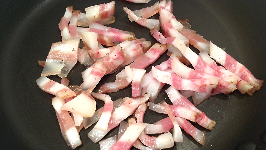 El guanciale no debe quedar demasiado crujiente.Apaga el fuego cuando esté en su punto y vierte un cazo de agua de cocción sobre él.