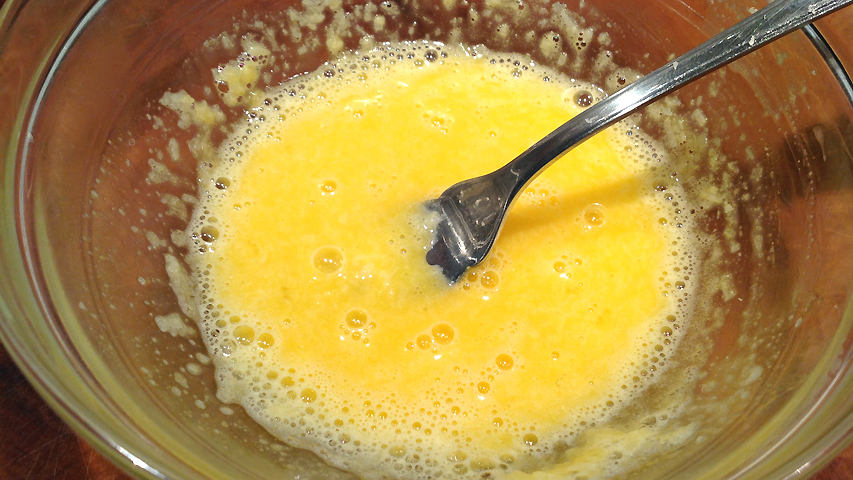 Vierto el agua de cocción que reservé en la jarra sobre las yemas con queso y mezclo bien. El agua no debe estar caliente para que no cuajen las yemas.