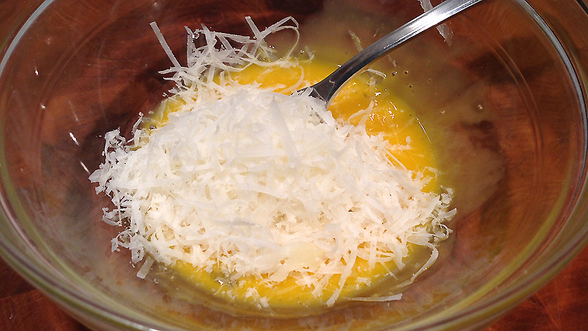 Añade sobre las yemas el queso rallado y bate hasta obtener una mezcla homogénea. Añade también agua de cocción de la pasta (que no esté caliente) y mezcla hasta obtener una especie de crema líquida.