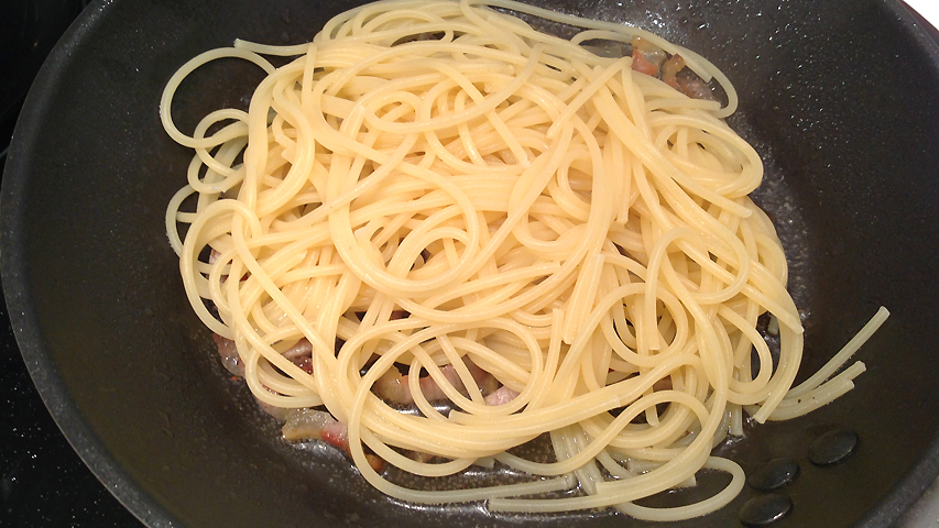 Cuando la pasta esté a tu gusto, ponla en la sartén junto al guanciale.