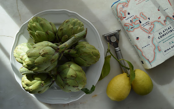 Para hacer este plato he confiado una vez más en Mina Holland y en su atlás comestible donde comparte una receta muy fiable y bien detallada de Jacob Kennedy para hacer las alcachofas y no morir en el intento. Debéis saber que este es el tipo de plato para el que no es ninguna tontería contar con un termómetro de cocina o una freídora con control de temperatura. El ojo de buen cubero puede no dar el resultado crujiente esperado. No es una receta difícil pero tiene su aquel y es mejor estar preparado.
