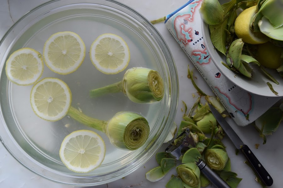 1. Lava y pela las alcachofas y deja en remojo en agua acidulada con zumo de limón, para que no se oxiden, hasta que el momento de freír. (Para lavar las alcachofas, pela las hojas exteriores hasta que empiece a blanquear. Después con un cuhillo o rallador pela también el tallo y la parte inferior de la flor de la alcachofa. Por último corta la punta de la alcachofa de manera que quede plana y se vean todas las capas interiores hasta el corazón. Si la alcachofa tiene mucha pelusa en el corazón es interesante quitarsela con un descorazonador, aunque no prometo que sea fácil y yo no lo he hecho).