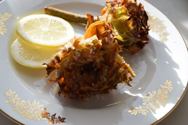 A pesar de que no dí con la alcachofa adecuada no pude quedarme quieta y al final me conforme con hacerlo con alcachofas blancas de Tudela y no me arrepiento de nada porque el resultado fue un éxito rotundo. Nadie merece privarse de carciofi alla giudea por muy lejos de Roma que esté.